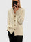 Kötött kardigán V-nyakkivágással és enyhén laza sziluettel. A karokon és az alsó szegélyen található halmintás sávok stabil formát biztosítanak, míg a szív alakú fém gombokkal való záródás kifejező, de letisztult részletet ad. Viselje nyitva, mint felső réteg, vagy gombolja be pulóverként – a laza stílustól az irodai megjelenésig.
