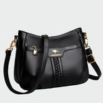 Egy elegáns női válltáska fekete színben, tartós, kiváló minőségű műbőrből készült. Diszkrét fonott minta található az elején, amely különleges karaktert kölcsönöz neki, míg az arany fém elemek luxus érzetet adnak. A állítható vállpánt kényelmes viselést biztosít, így ideális választás mindennapi használatra.