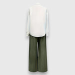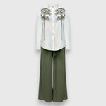 A Nivana szett elegáns blúzt kombinál finom virágmintákkal és laza, széles szárú nadrágokkal – ideális stílusos napokra. A könnyű anyag és a magas gallér nőies és kifinomult megjelenést kölcsönöz az egésznek.