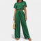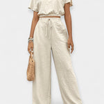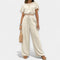 Ez a szett a laza szabásával és a benne rejlő kényelmével tűnik ki. A puffos ujjú rövid top harmonikusan kombinálható a derékban állítható magas derekú nadrággal, stílusos megjelenést teremtve boho akcentusokkal – ideális a legmelegebb napokra az évben.