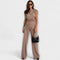 Szoborszerű elegancia modern árnyalattal: A Szofia szett aszimmetrikus felsőt kombinál széles nadrágokkal, amelyek stílusosak és elegánsan omlanak. Ideális különleges alkalmakra vagy a mindennapi megjelenés könnyed felfrissítésére.