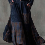 Az Elisa ruha a vintage stílus erejét ötvözi egy időtlen bohémi eleganciával. Környezetbarát tengerészkék velúrból és földszínekben pompázó kockás panelekből készült, ez a darab textúrákat és mozgást egyesít egy olyan dizájnban, amely a kézművesség karakterével tűnik ki.