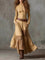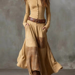 Az testhezálló felső fém gombokkal kiemeli a sziluettet, míg a folyó szoknya patchwork részletei dinamizmust és bájt adnak minden lépésnél. Egy ruha, amelyet szabad léleknek és a megkülönböztetést kedvelő nőknek terveztek.