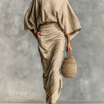 Ez a két részes dizájn egy laza, hosszú ujjú denevér stílusú felsőt és egy hosszú, folyékony szabású szoknyát mutat be, tökéletes egyensúlyt teremtve a kényelem és a kifinomultság között.