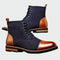 Férfi **bőr cipők fűzővel** elegáns sötétkék és barna kombinációban, amelyek örök eleganciát sugároznak. A fényes barna orr- és sarokvég prémium jelleget kölcsönöz, míg a **tartós talp** stabil lépést biztosít. Ideális választás üzleti casual, de formális alkalmakra is.