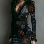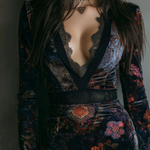 Ez a Mini Bodycon Velúr Ruha Virágmintával Boho Stílusban a elegancia és a stílusos chic tökéletes ötvözete. Luxus velúrból készült, a ruha egy gyönyörű bohem virágmintát mutat be, amely varázst és kifinomultságot ad. A mély V-kivágást finom csipkés szegélyek emelik ki, romantikus és nőies érzetet biztosítva.