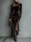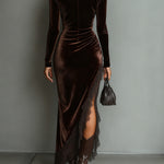 Isabella - Maxi Fitted Ruha Csokoládé Bársonyból Aszimmetrikus Csipkével