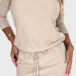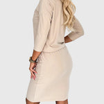 Ez a sportos bézs ruha tökéletes választás, ha a kényelemről nem szeretnél lemondani, de a stílus is fontos számodra. A 3/4-es ujjak, a praktikus zsebek és a derékban megkötős kialakítás lehetővé teszik, hogy a ruhát pontosan az alakodhoz igazítsd. A rugalmas, puha tapintású anyag finom, velúros hatású felülete egész napos komfortot biztosít, miközben nőies és rendezett megjelenést ad. Ideális hétköznapi viseletre, laza találkozókra vagy könnyed kiruccanásokra.