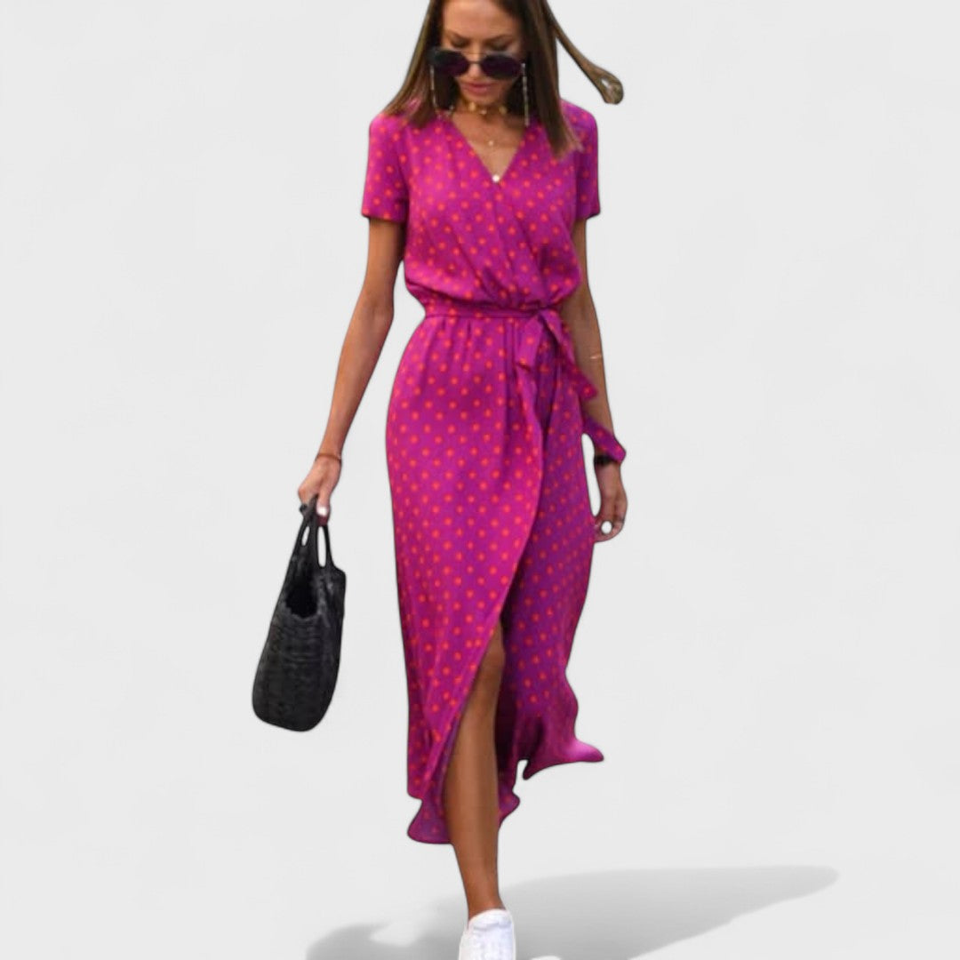 A Daniella ruha klasszikus, modern ízléssel – a finom pöttyös minta és a szabályozható fodros fazon örök divatot teremt. A könnyű anyag csodálatosan illeszkedik, lehetővé teszi a bőr lélegzését, és friss érzést biztosít még a forró napokon is. Ideális választás tavaszi piknikhez, baráti brunchhoz vagy esti városi sétához.