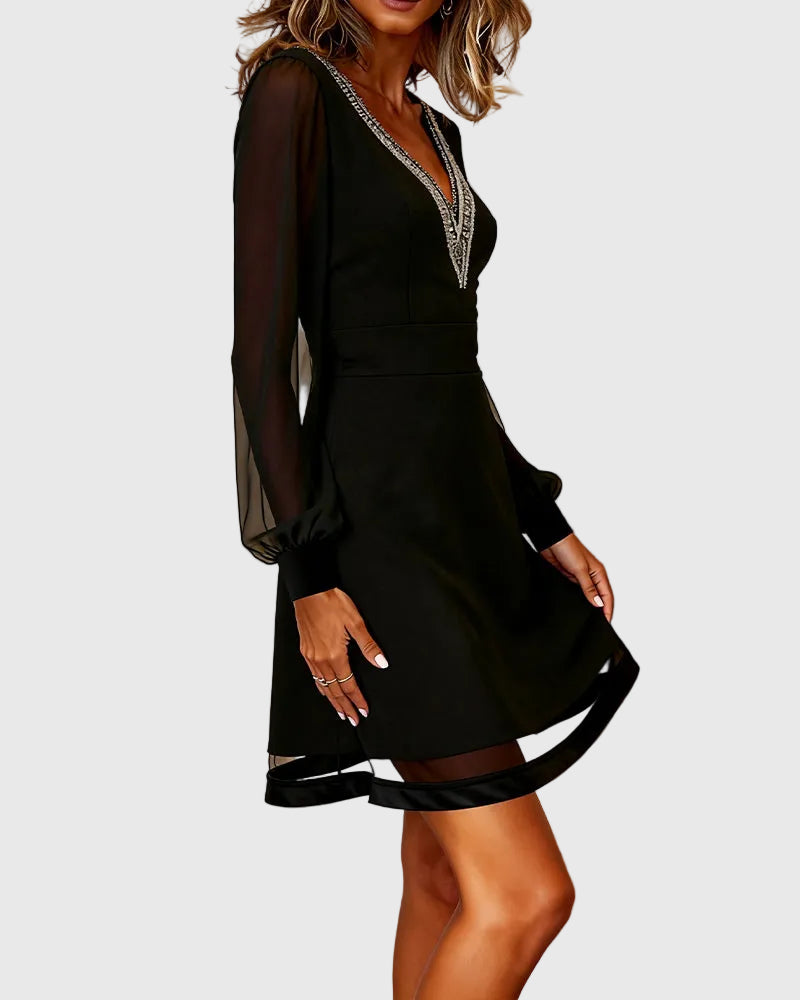 Elegáns, nőies és kifinomultan könnyed — ez a karcsúsító ruha úgy lett megalkotva, hogy magabiztosságot adjon minden lépésnél. A mély V-nyakkivágás finoman hangsúlyozza a dekoltázst, míg a gondosan elhelyezett betétek és az enyhén lebegő ujjak karcsú, harmonikus sziluettet formálnak. Tökéletes választás különleges alkalmakra, vacsorákra vagy elegáns esti megjelenésekhez.