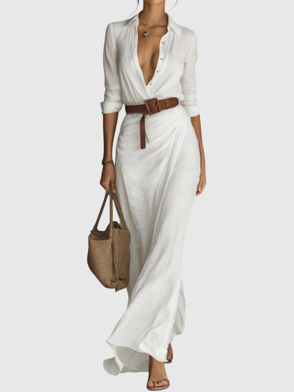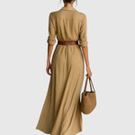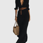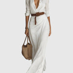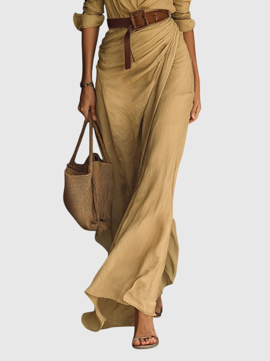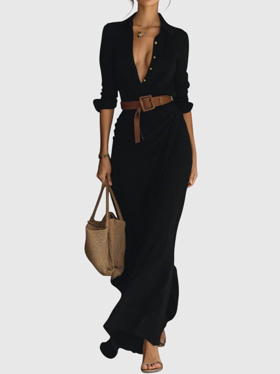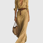 Hosszú ruha kifinomult dizájnnal, könnyű és lágy textíliából készült, amely természetes mozgást és tökéletes illeszkedést biztosít. Mély "V" dekoltázsú, amely kiemeli a nyakat, hosszú ujjak mandzsettával és a szoknya körkörös részlete, ami nőies és lenyűgöző megjelenést kölcsönöz. Tartalmaz egy övet, amely hangsúlyozza a derékvonalat és kiemeli a sziluettet. Tökéletes választás szabadidős tevékenységekre és különleges alkalmakra egyaránt.