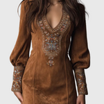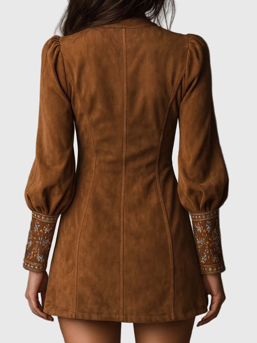 A hímzett mini velúr ruha Lila a hasonló velúr puhaságát ötvözi a nyakban és a mandzsettákon található finom virágmintákkal, hogy egy nőies és különleges megjelenést biztosítson. A V-nyak optikailag nyújtja a sziluettet, a puffos hosszú ujjú kialakítás kiegyensúlyozza a formát, míg a mini hosszúság karaktert ad anélkül, hogy túlzó lenne – tökéletes délutántól estig, akár kék, akár melegebb árnyalatokban.