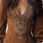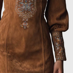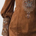 Kifinomult virágos hímzés – díszítő minták a nyakon és a mandzsettákon, amelyek vintage ihletésű kézműves bájt adnak.