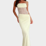 Hangsúlyozza nőiességét és eleganciáját ezzel a hosszú ruhával, amely finom pasztell sárga színben pompázik. A finom csipke kombinációja a fűzőn és a testhez simuló alsó résszel rendkívül vonzó és kifinomult megjelenést kölcsönöz, ideális esti programokhoz vagy különleges alkalmakra.