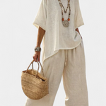 Tiszta egyszerűség természetes eleganciával. A Daisy szett laza és monokróm sziluettjével tűnik ki, ideális azok számára, akik kényelmet és tiszta stílust keresnek. Könnyű anyagból készült, ez a megjelenés minden mozdulatot frissességgel és elegáns lazasággal kísér.