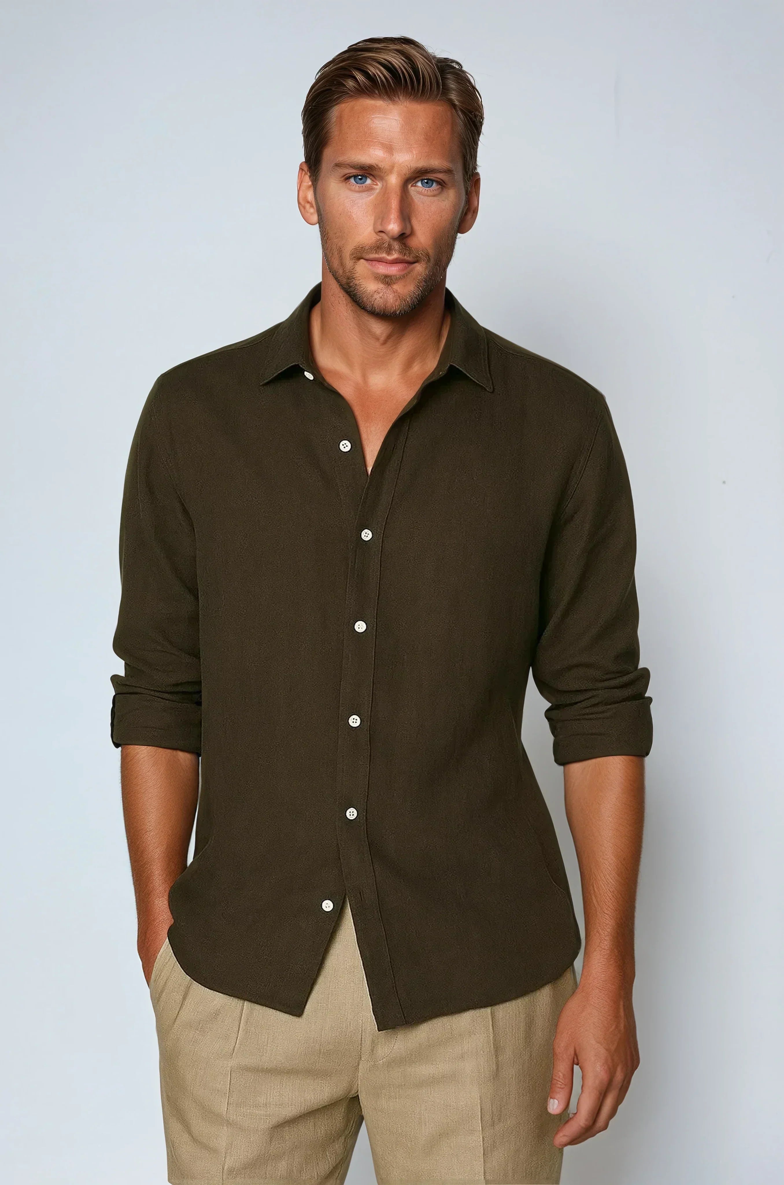 A stílusos sötétbarna szín kifinomult, örök megjelenést kölcsönöz ennek a len ingnek, amely kiválóan kiegészíti a különböző stílusokat. Kombinálja az inget világos nadrágokkal vagy chino nadrágokkal egy elegáns nyári megjelenésért, vagy viselje sötét farmernadrággal egy laza és stílusos outfitért. Az örök design miatt ez az ing ideális választás bármilyen alkalomra.