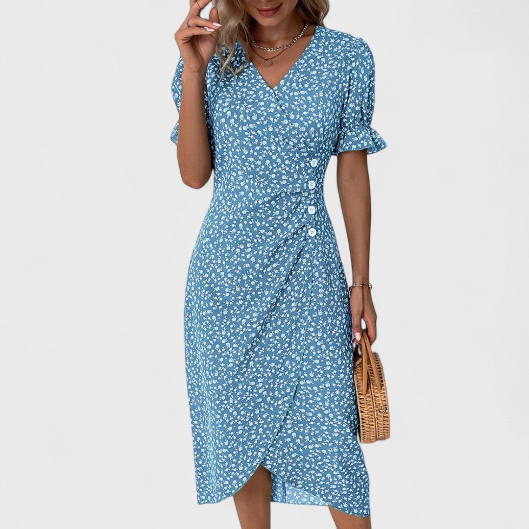 Az Irena ruha a finom virágos mintát ötvözi a kifinomult szabással, amely gyengéden eltakarja a hasat, és kényelmet, valamint magabiztosságot biztosít a viselőjének. A könnyű anyag szépen omlik, míg az örök szabás és a diszkrét részletek kiemelik a természetes bájt minden lépésnél. Ideális választás a stílussal és kényelemmel teli nyári napokra.