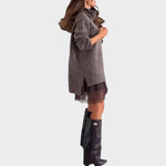 Ez a szett egy extra nagy, magas nyakú, puha, meleg és laza szabású pulóverből áll, amelyet hétköznapi stílusra terveztek. A ruhadarabot egy könnyű és finom csipkés alsószoknya egészíti ki, amelynek alján tüllréteg található, ami mozgást, bájt és egy diszkrét szexi érintést ad a megjelenésnek.